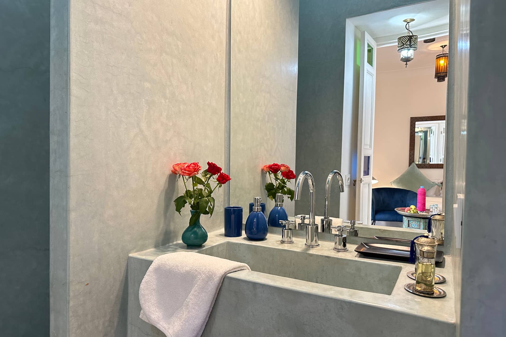 Let yourself be enchanted by the cheerful and imposing interplay of colors. The large, modern bathroom, which is decorated in fresh colors and with underfloor heating. The choice between a double bed or two single beds is ideal for friends and couples reposefully holidaying in Marrakech, at Riad Albatoul.