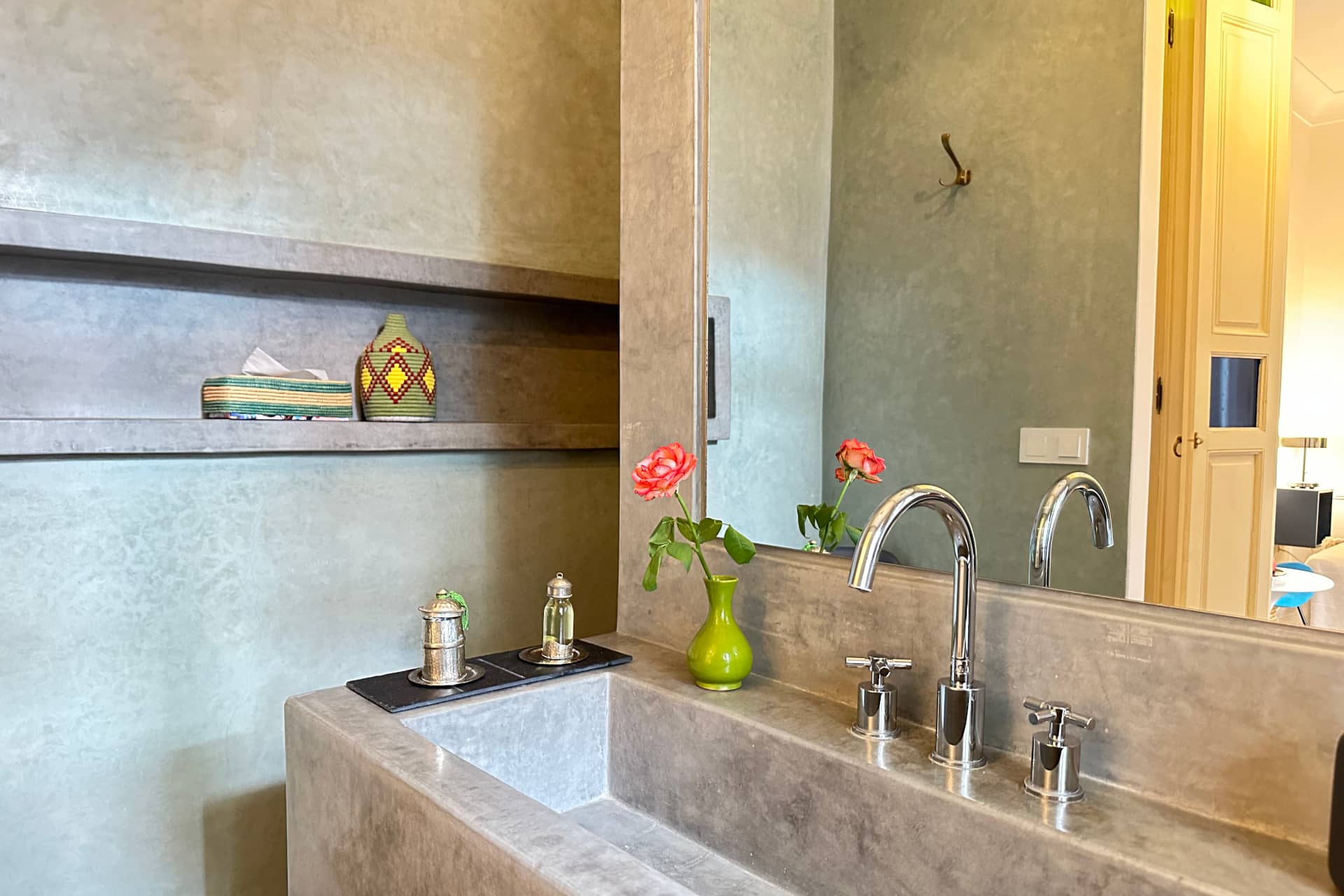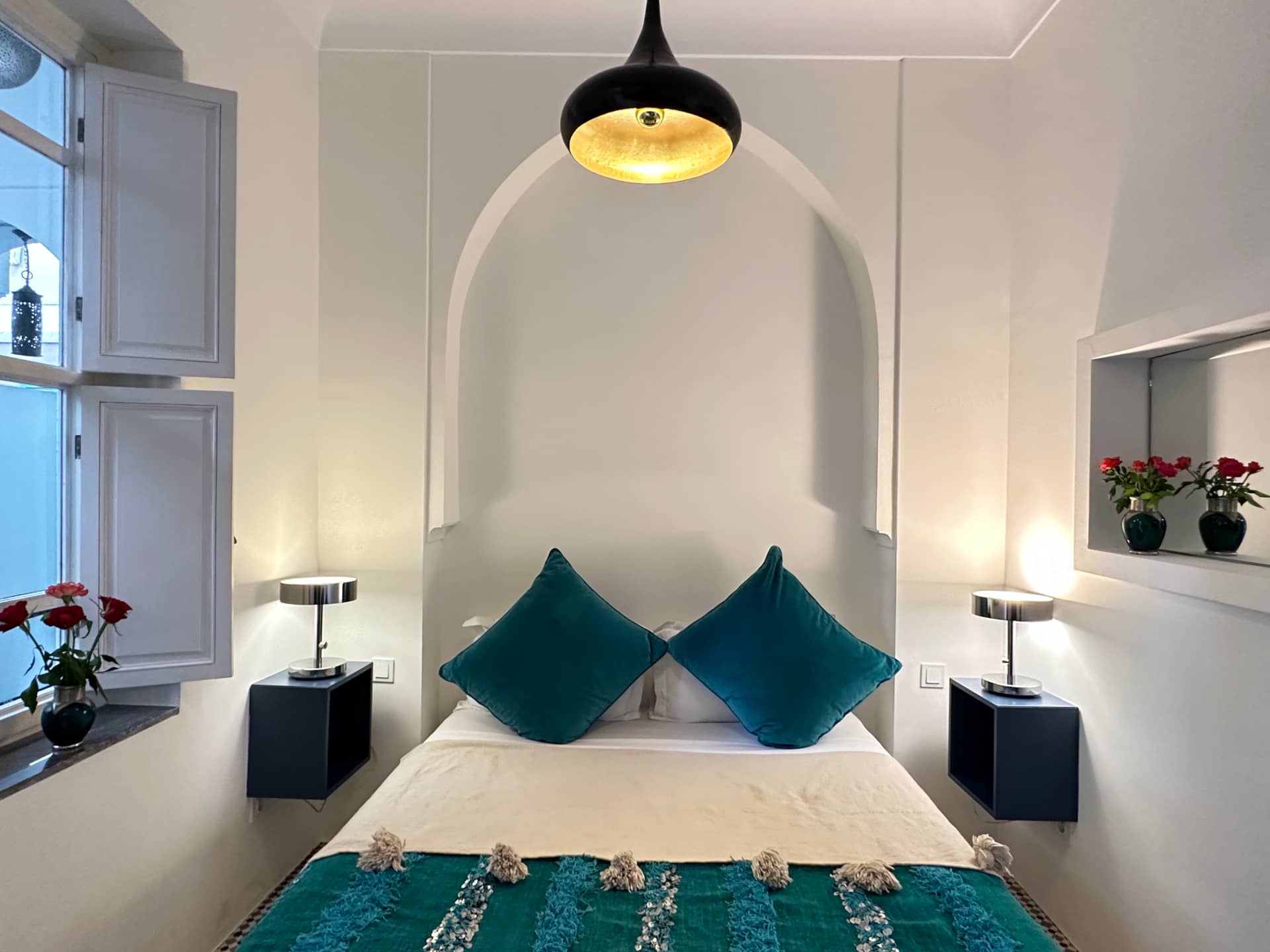 Relax while listening to the chirping of birds in the courtyard. Our exquisite Dihya room, opening into the courtyard and facing the pool. The large, modern bathroom has walls made of hand-crafted Tadelak in refreshing blue-green colors and underfloor heating. The Dihya room is equipped with a comfortable double bed and is ideal for couples looking for an enjoyable time.