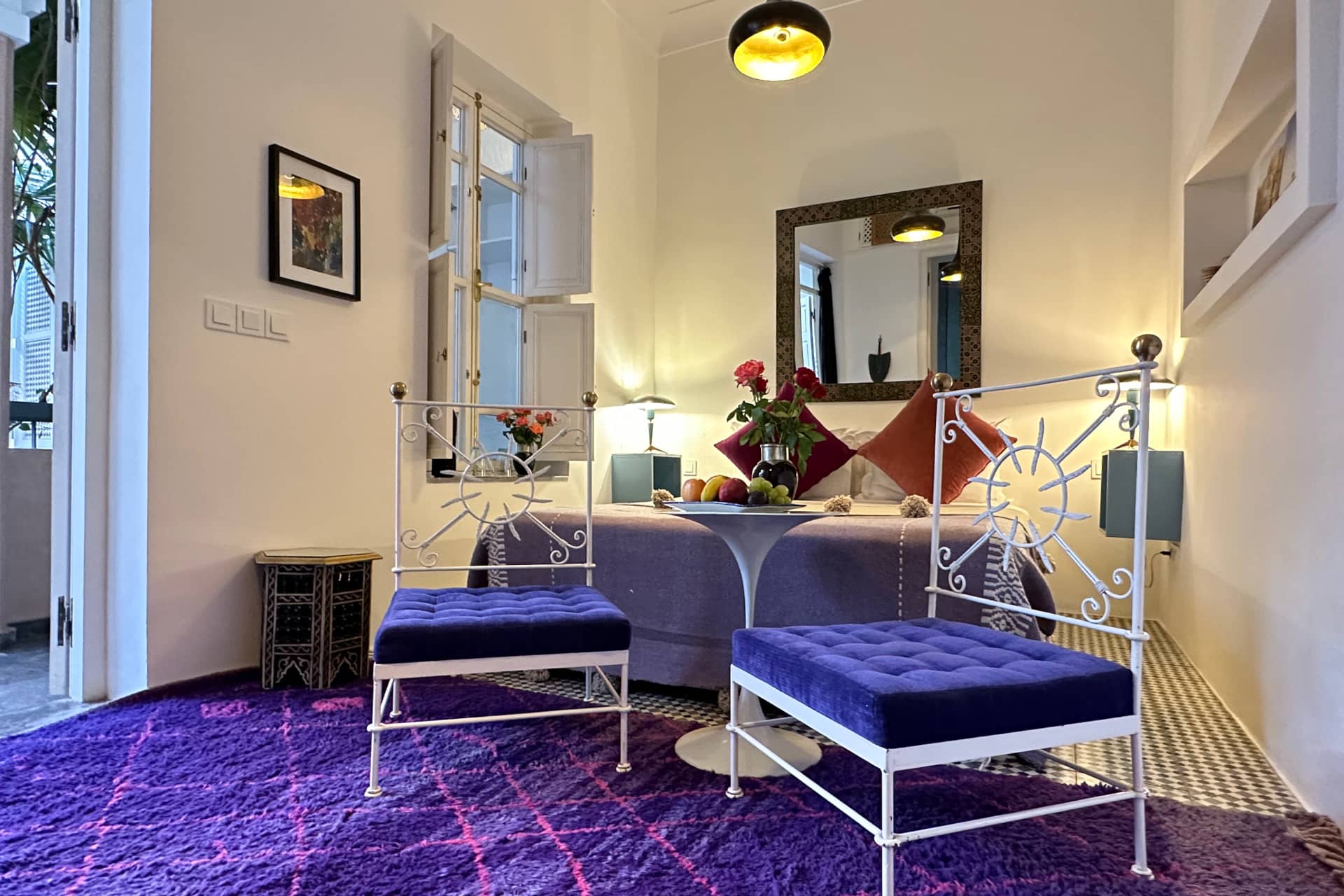 Let yourself be enchanted by our awesome Room Saida. The large, modern bathroom has walls made of hand-crafted Tadelak in refreshing blue-green colors and underfloor heating. The comfortable double bed is designed for couples keen on great holidays.